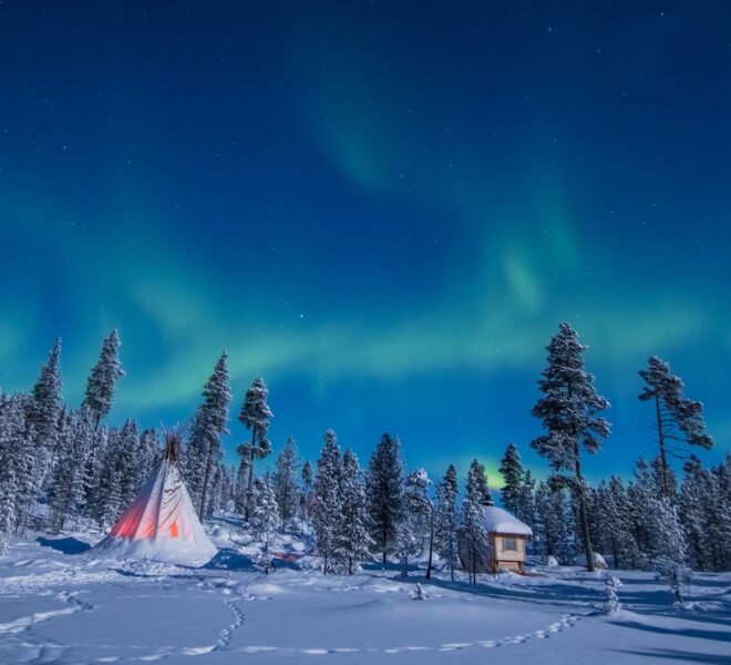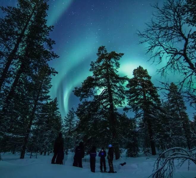 Stroll through silent, snowy forests under a starry Arctic sky.