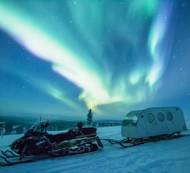 Ride the heated Aurora sleigh through snowy wilderness and capture the night sky.